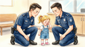 The automatic doors of the police station slid open with a soft mechanical sigh, letting in a rush of cold winter air and a family that looked as though it had not slept properly in days. The father stepped in first, tall and stiff, his shoulders drawn upward in tension, while the mother followed closely behind, one arm wrapped protectively around a small child whose face was blotchy from crying. The little girl could not have been more than two years old, yet her expression carried a weight that did not belong to someone so young, and her eyes were red and glossy as though tears had become her constant companion.