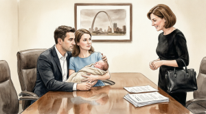 The room is too cold, the air carrying that stale blend of coffee, carpet cleaner, and paper that always seems to cling to law offices. The long mahogany table gleams under fluorescent lights. A framed print of the St. Louis skyline hangs slightly crooked behind the head chair, and for one absurd second you want to straighten it, because if one thing in this room can be corrected, maybe the rest can too.