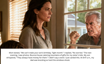 Mom texted, “We can’t make your son’s birthday. Tight month.” I replied, “No worries.” The next evening, I saw photos. Bounce house catering mountains of gifts for my sister’s kids. My son whispered, “They always have money for them.” I didn’t say a word. I just canled this. At 8:47 a.m., my dad was knocking so hard the windows shook. Read More